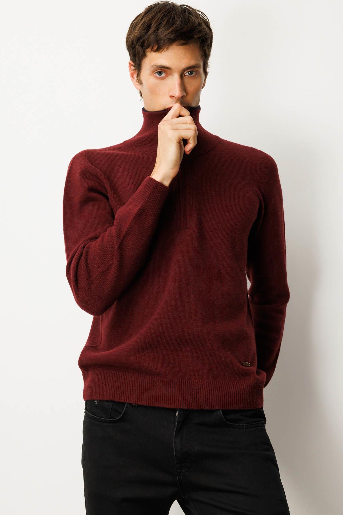 23529Erkek Yakası Fermuarlı Basic Yün Kazak Bordo