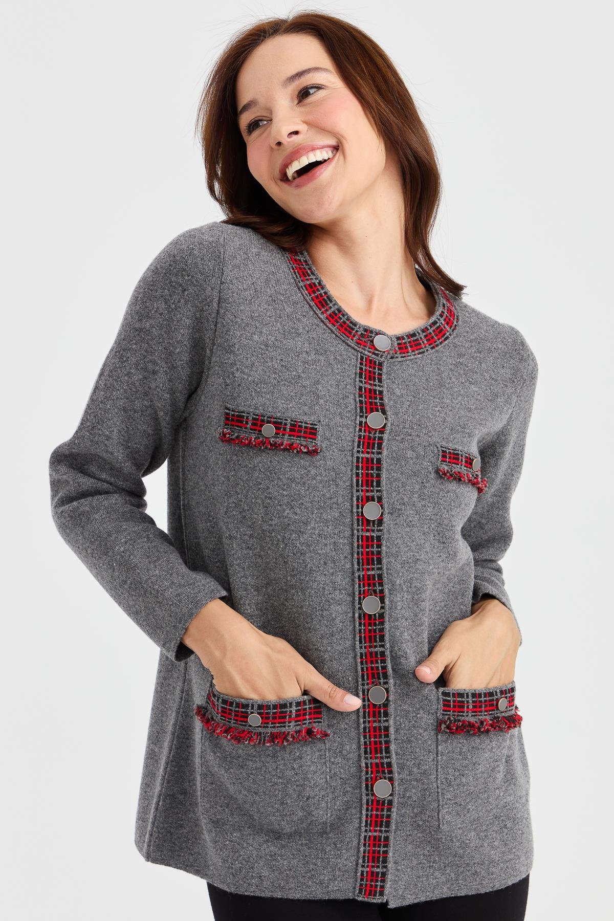 23013Kadın Sıfır Yaka Püsküllü Kare Aksesuarlı Yün Kaban Füme