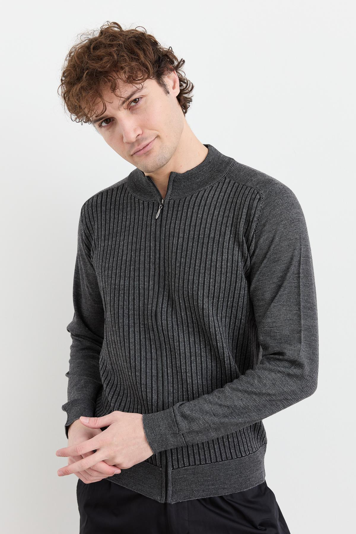 21503Erkek Boyuna Çizgili Triko Yün Ceket Füme