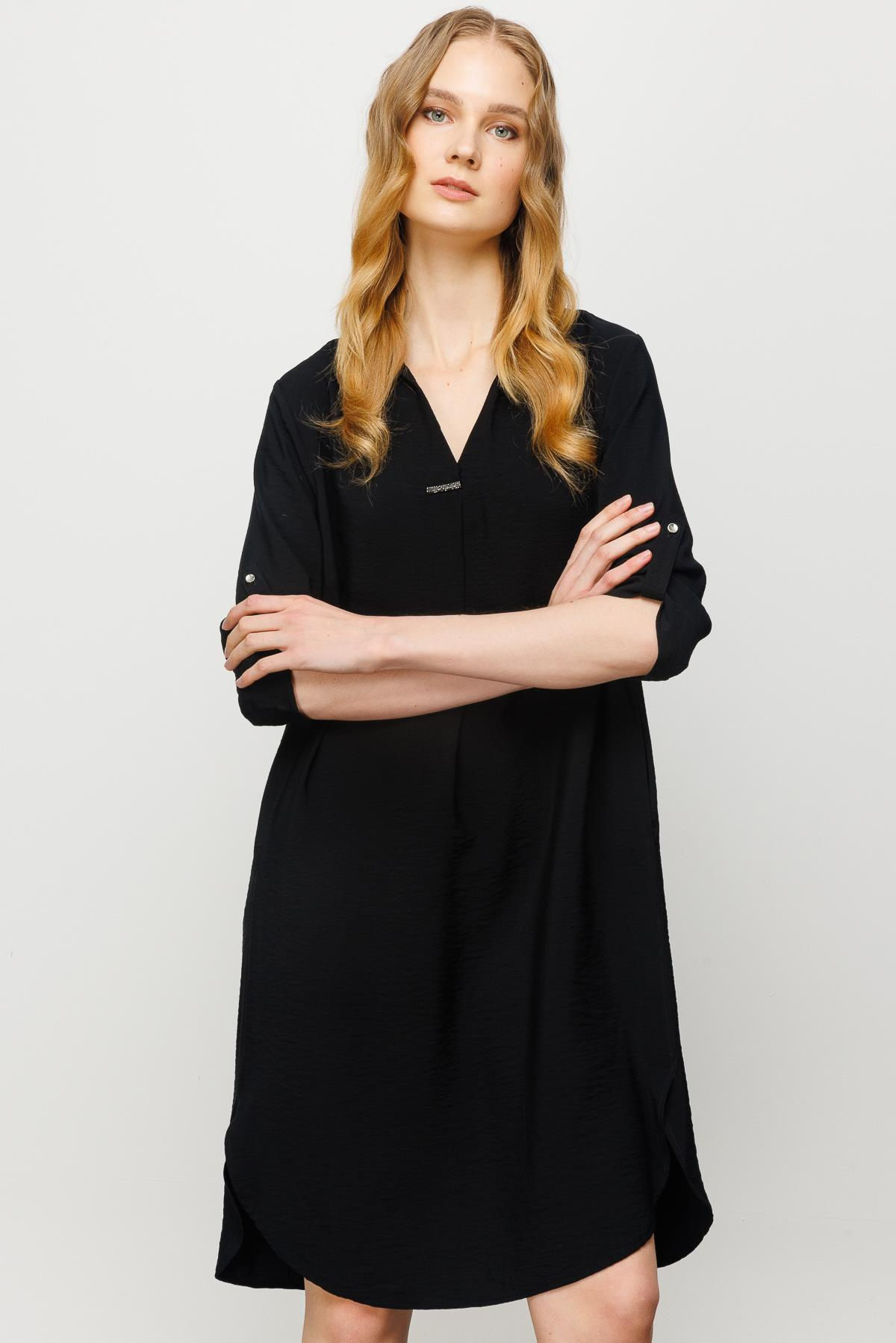Kadın Gömlek Yaka Pileli Elbise Siyah (23466)
