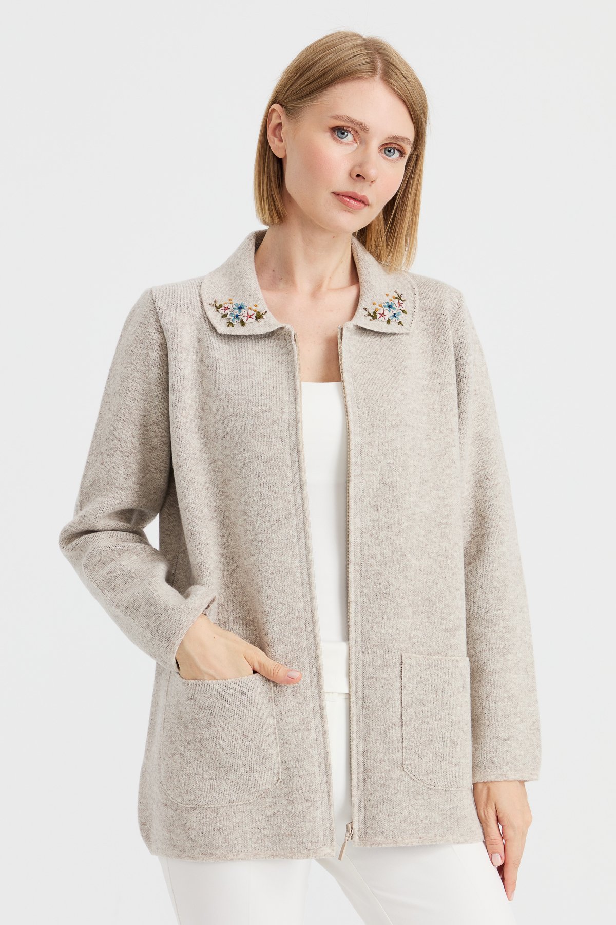 23002Kadın Polo Yaka Kenarı Dantel İşlemeli Yün Hırka V.Bej