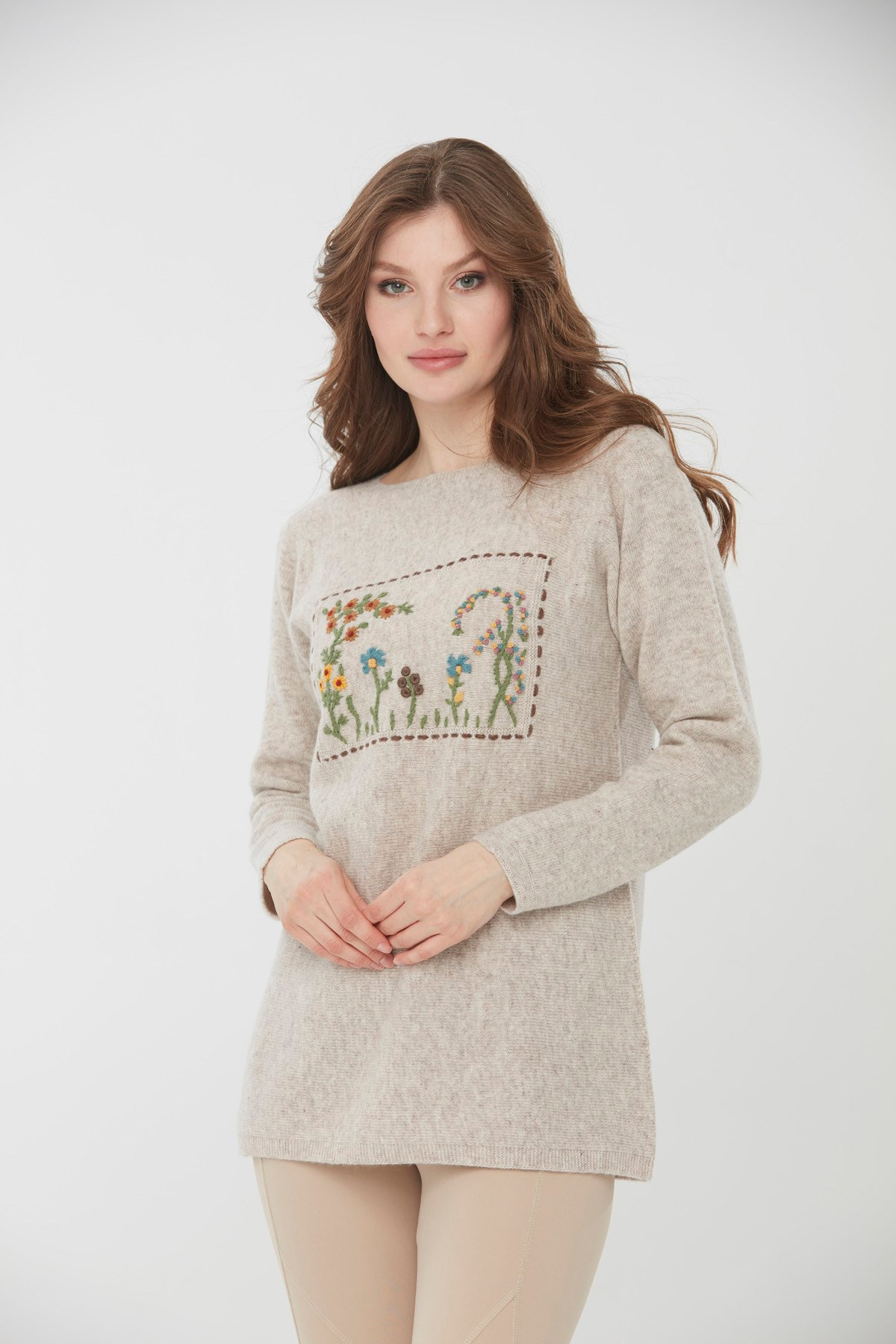 22006Kadın Sıfır Yaka Önü Manzara İşlemeli Yün Kazak V.Bej