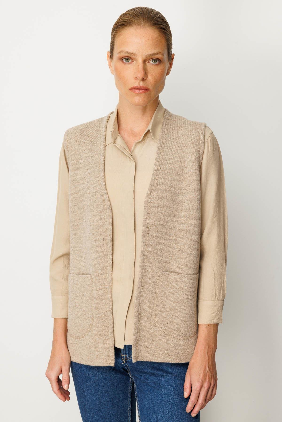 25044Kadın V Yaka Çelik Örgü Yün Anne Yelek K.Bej