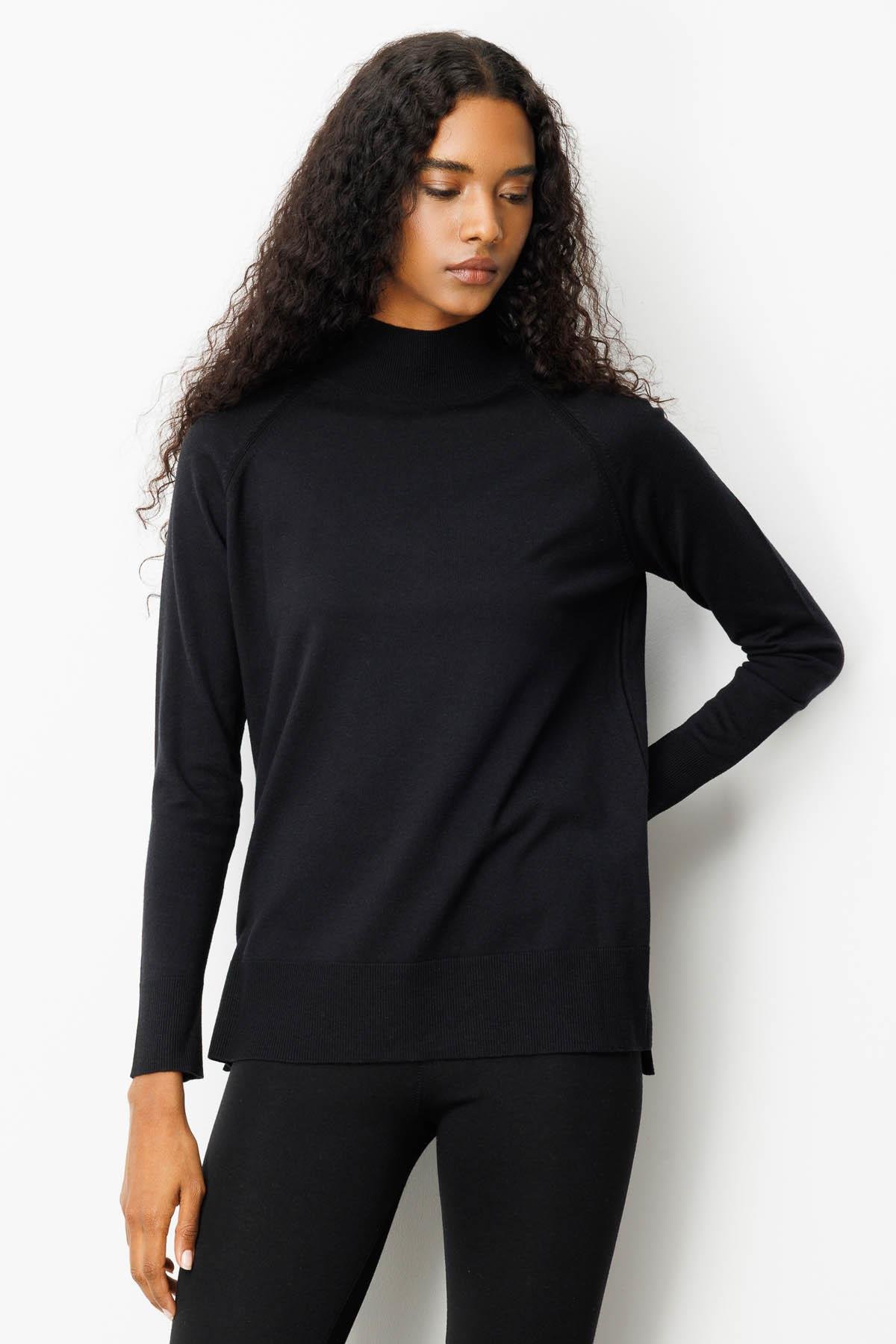 22305Kadın Yarım Balıkçı Yaka Yanları Yırtmaçlı Kazak Siyah