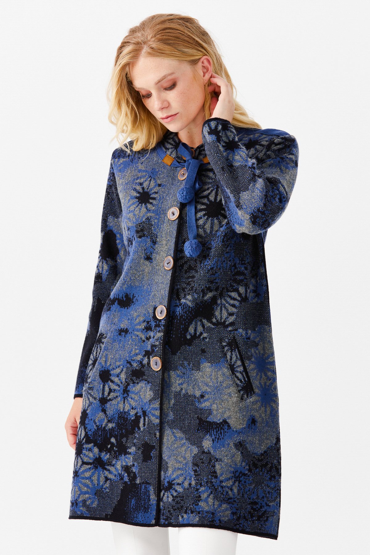 22159Женское длинное пальто с воротником-стойкой и рисунком, голубое