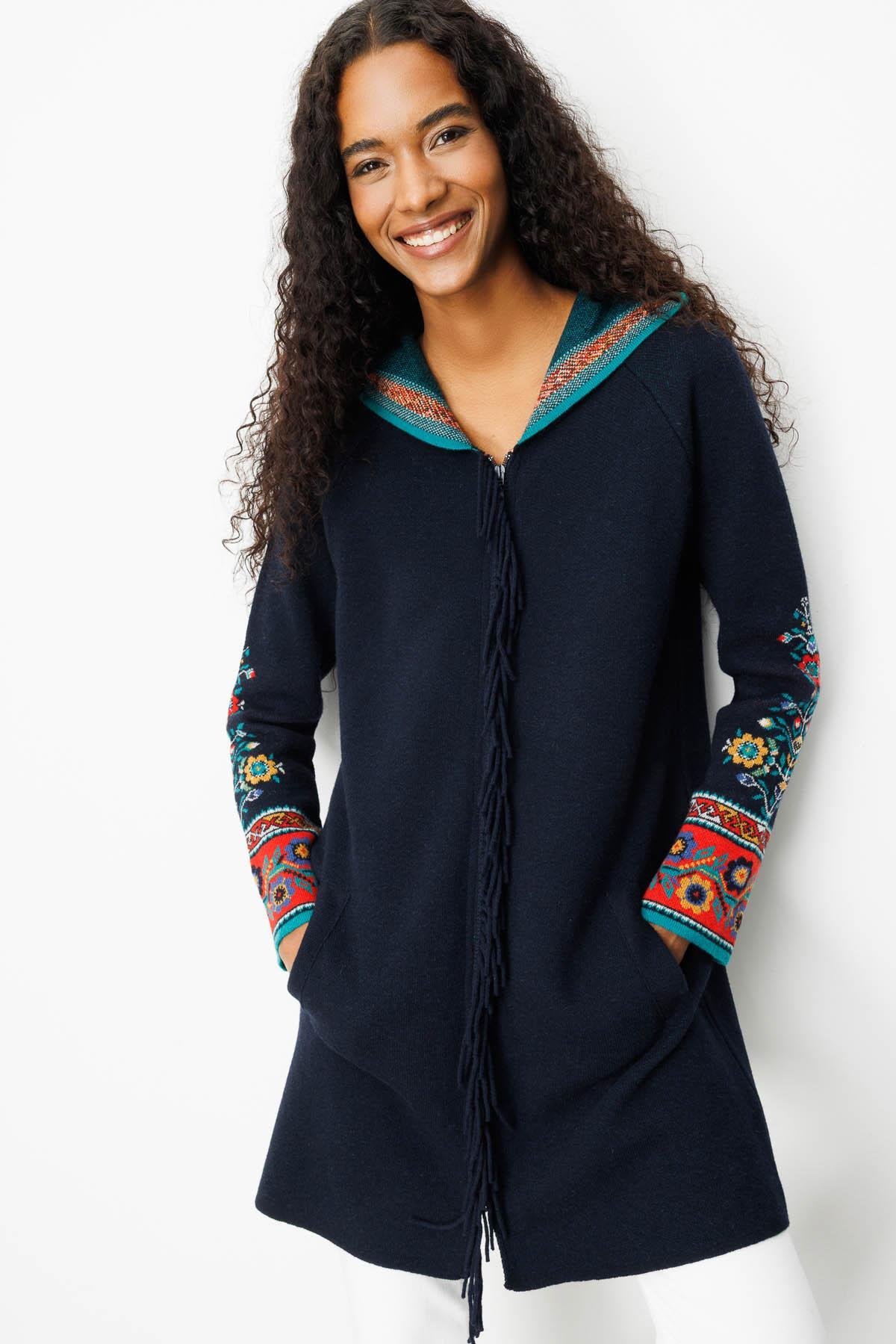 Kadın Kapüşonlu Kilim Jakarlı Püsküllü Yün Kaban K.Lacivert (25056)